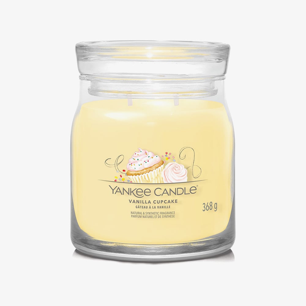 Fill your home with sweet scent with the Yankee Candle Vanilla Cupcake Signature Medium Jar Candle. Housed in a glass jar, this inviting soy wax blend candle brings your favourite scents of home baking with vanilla, chocolate and cake batter notes. The double wick is designed for the best burn and sent experience.