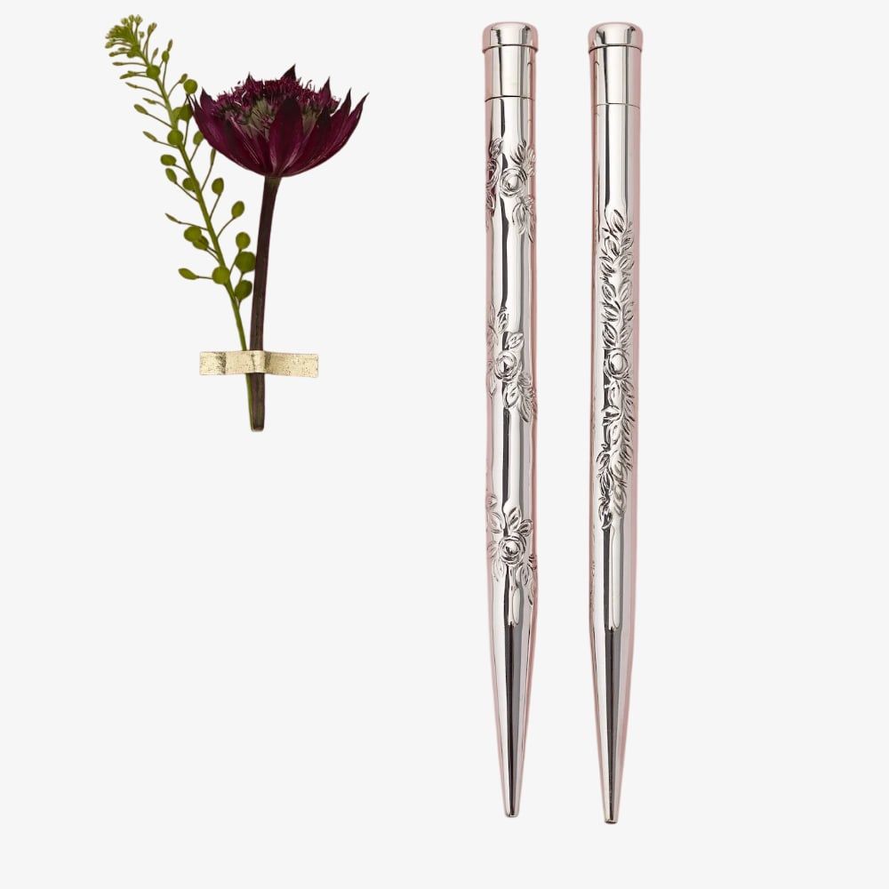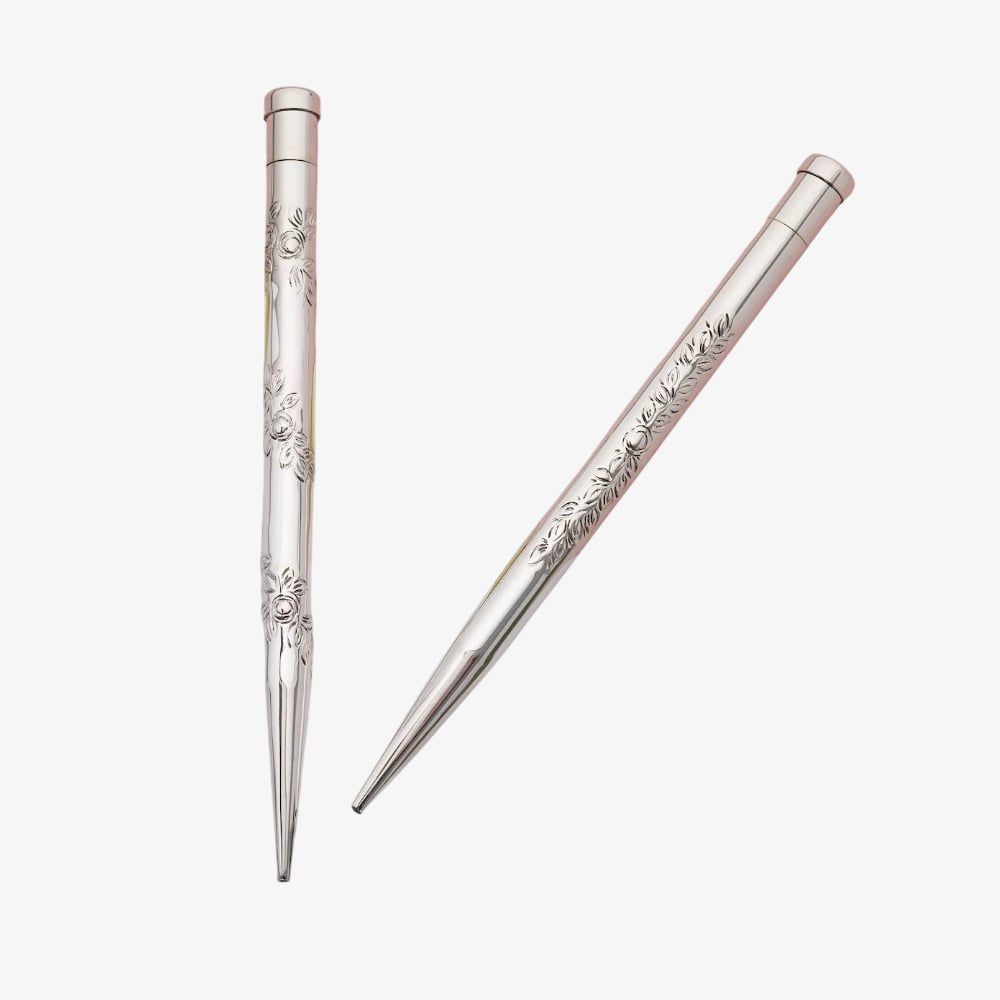 A delicate floral design, inspired by Yard O Led's historic hand-chasing technique, adorns the pen and pencil. The English roses, with their buds and leaves, gracefully wind around the silver barrels, creating a modern and elegant interpretation of the brand's timeless style.