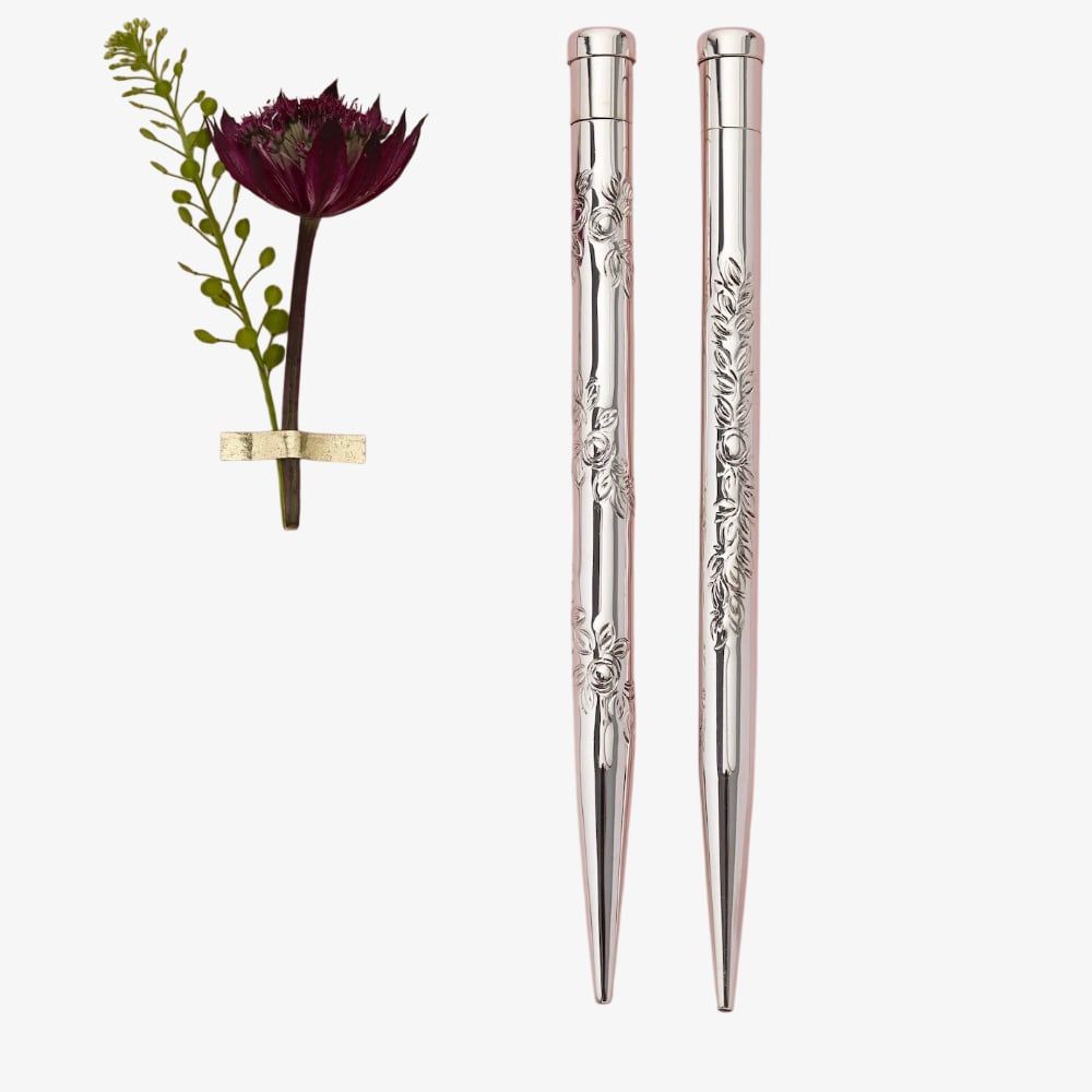 The floral design, inspired by the brand's 19th-century hand-chasing technique, offers a fresh, modern interpretation of Yard O Led's revered style. English roses, with their buds and leaves, gracefully curl around the silver barrels, evoking the spirit of an English country dance.