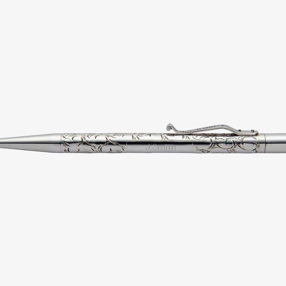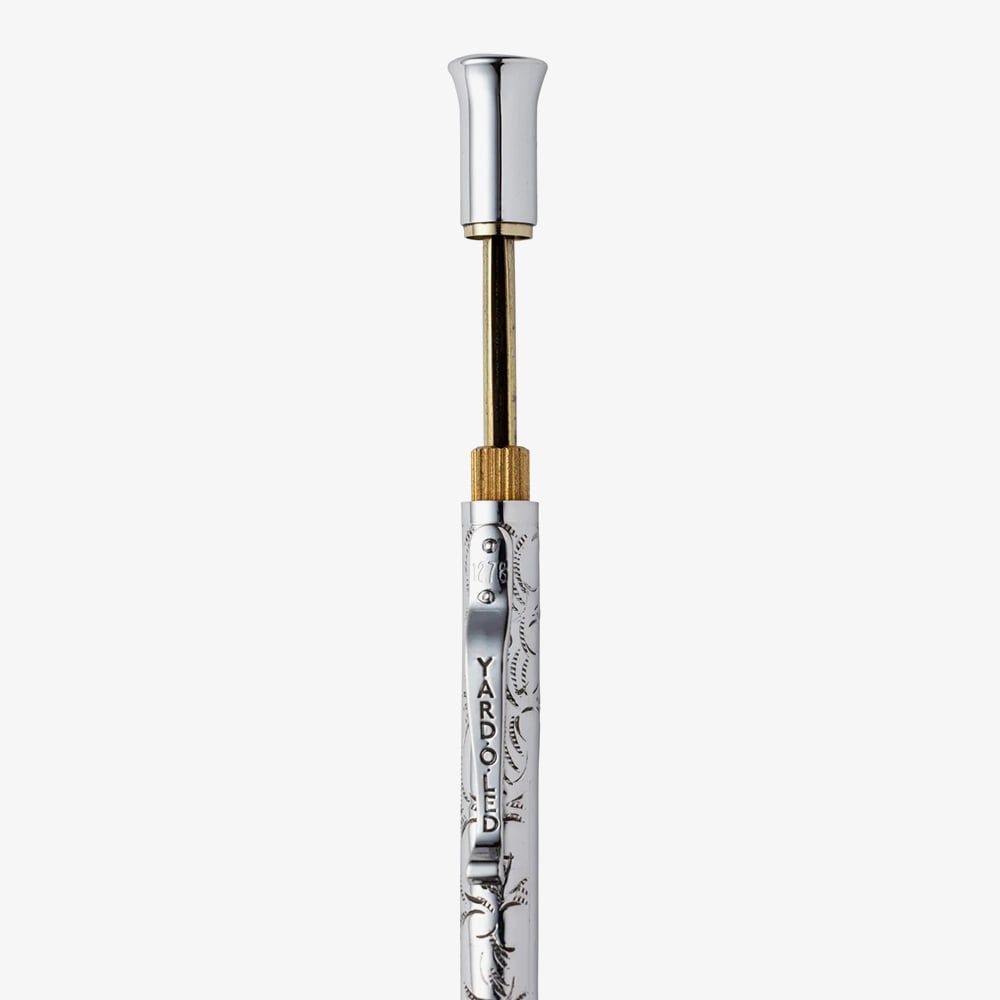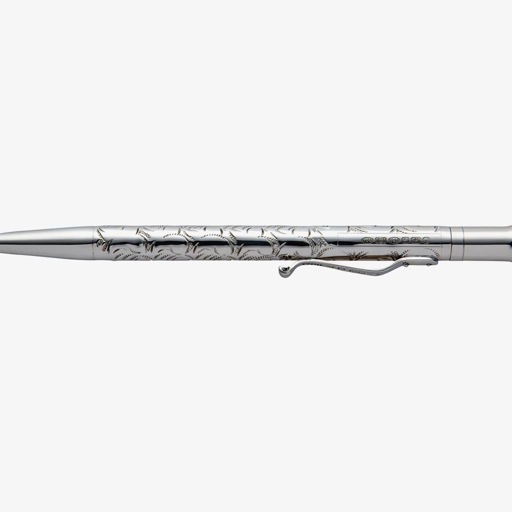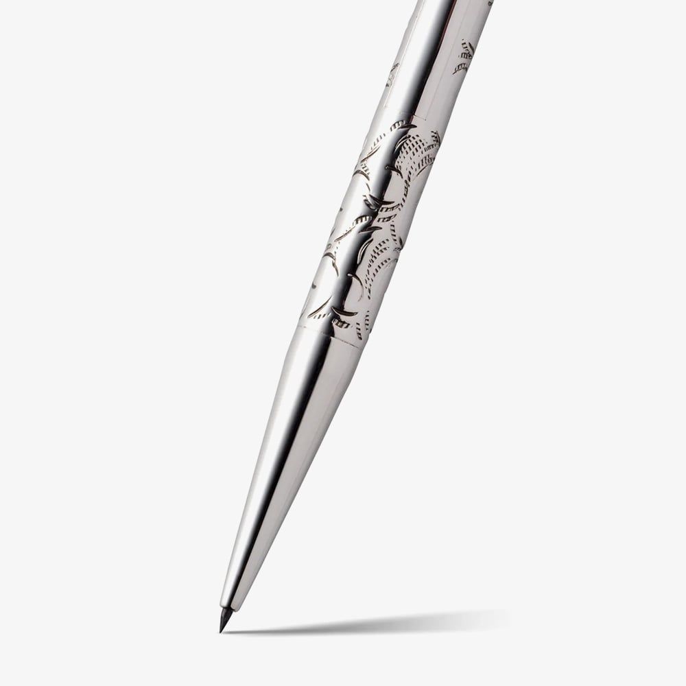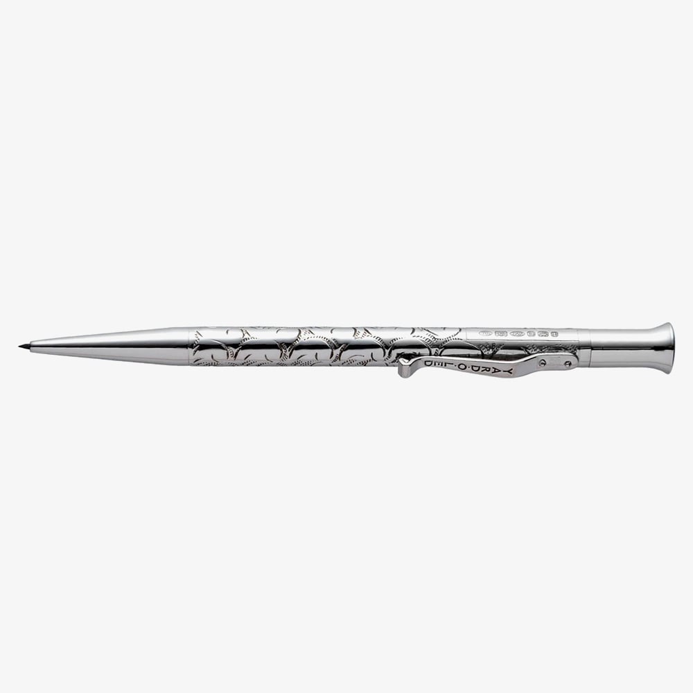 The Perfecta’s elegant, slender design and gently flared top create a lightweight, refined pen with a delicate silhouette, echoing the style of the early 19th century. Its timeless appeal is further enhanced by a key detail: every Victorian-patterned writing instrument is crafted through up to 3,000 hand-chasing taps, each performed by a skilled silversmith. This meticulous process ensures that every pen is a one-of-a-kind piece, with slight variations in the pattern making each one truly unique.