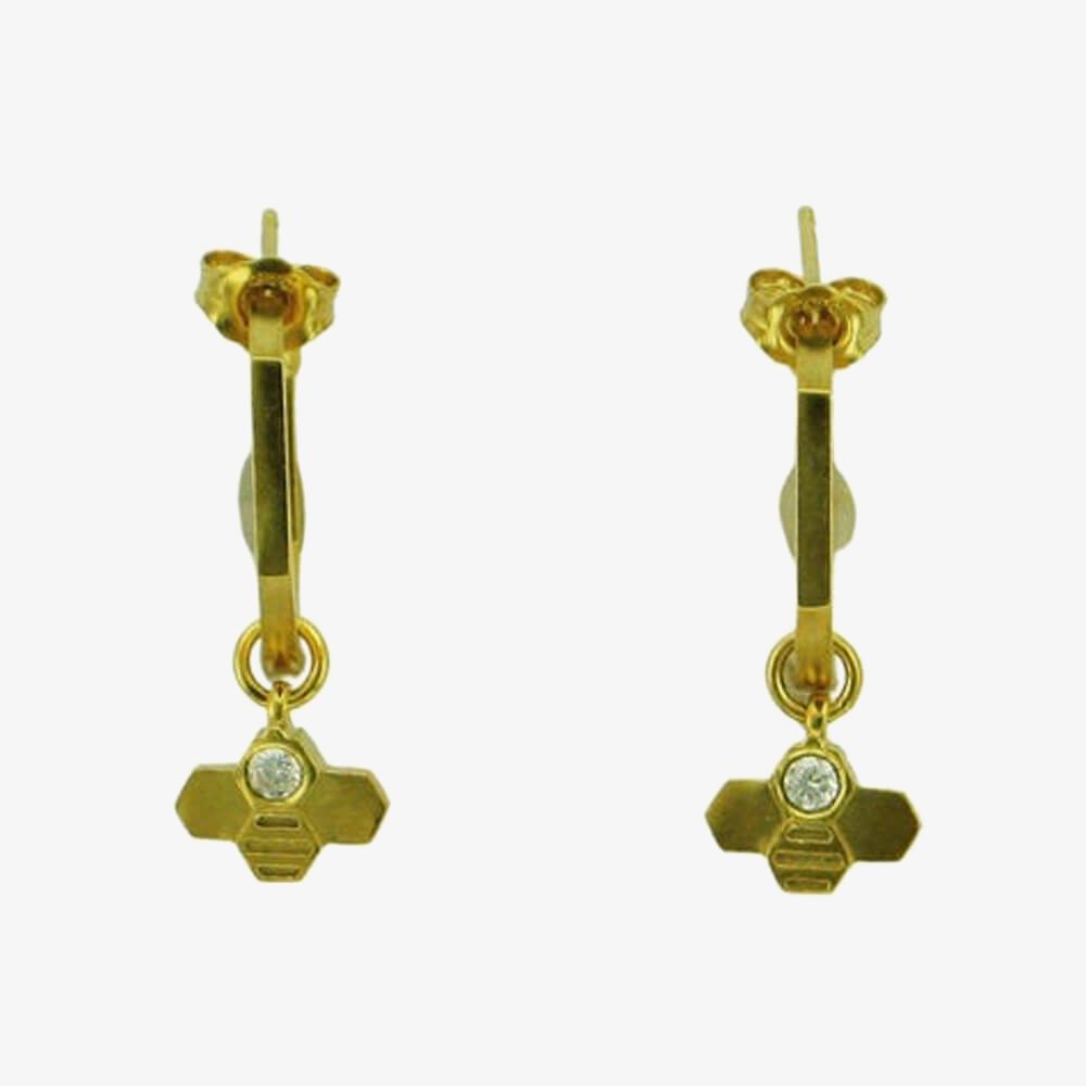 These beautiful yellow gold plated earrings feature a hexagonal hoop design with tiny hexagonal shaped bumble bee pendants set with sparkling cubic zirconia.
