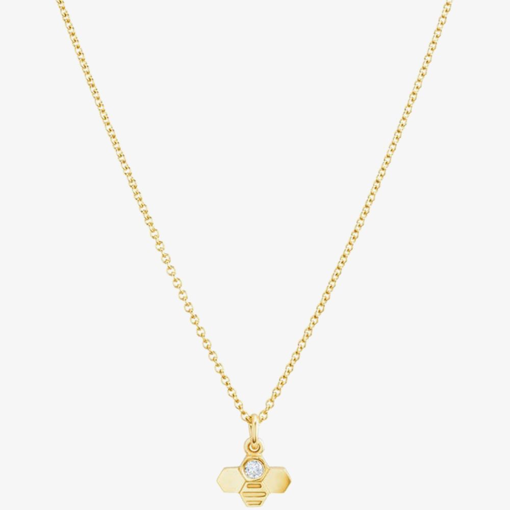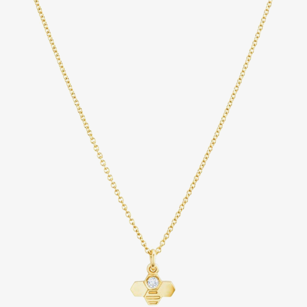 This beautiful yellow gold plated necklace features a tiny vertical hexagonal shaped bumble bee pendant which is set with a sparkling cubic zirconia.
