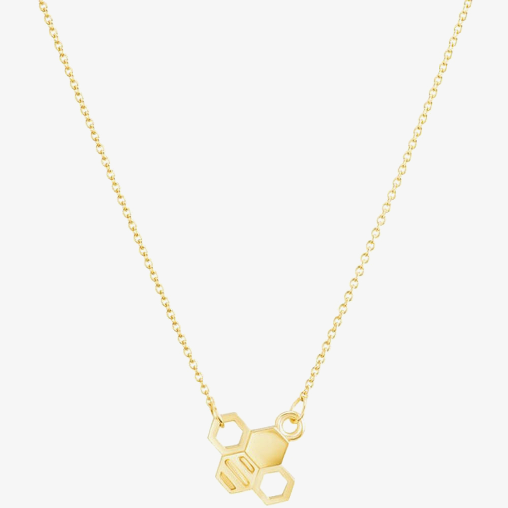 This beautiful yellow gold plated necklace features a large horizontal bumble bee motif with a hexagonal shaped design.