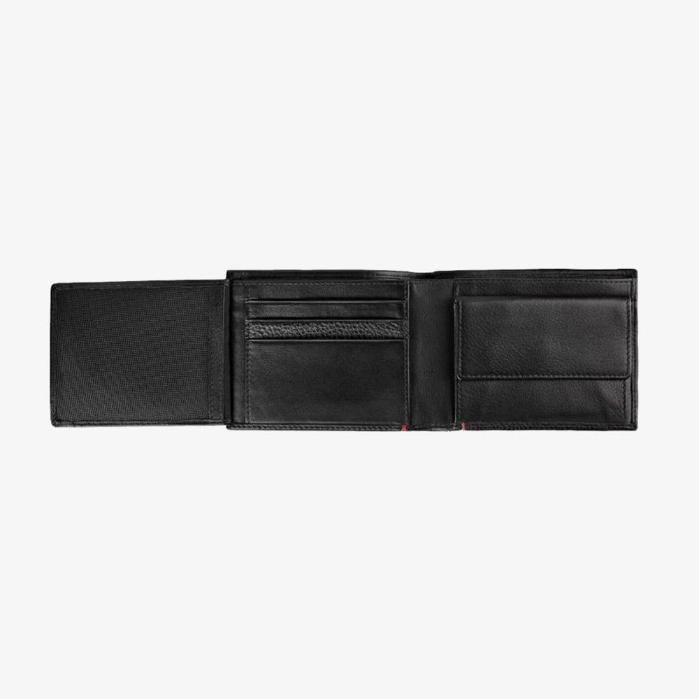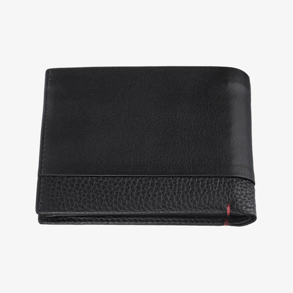Elegant and practical, this tri-fold wallet combines smooth and grained black leather for a sleek, unobtrusive design. Thoughtfully crafted, it features a coin slot, multiple card and note compartments and features RFID-blocking technology. Presented in a gift box, making it a perfect blend of style, functionality, and thoughtful gifting.