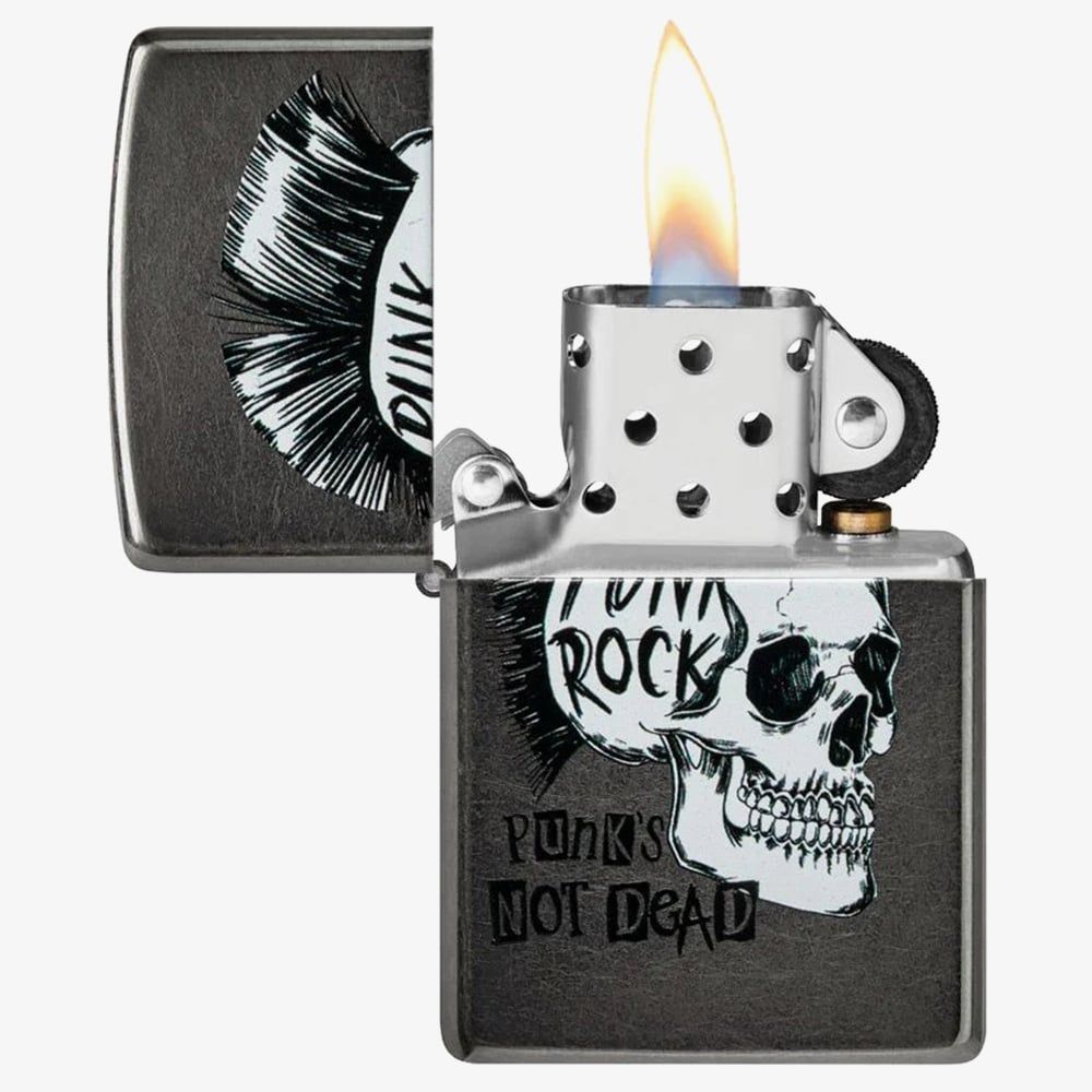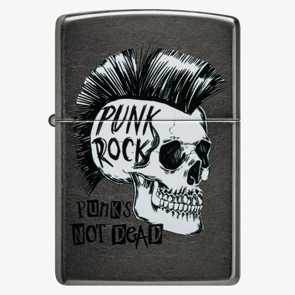 This bold Zippo lighter features a fierce grey punk rock skull design, bringing a rebellious edge to a sleek, all-metal case. With Zippo’s signature windproof construction and iconic "click," this lighter is built for durability and style in any setting. Packaged in a gift box. Fuel sold separately.