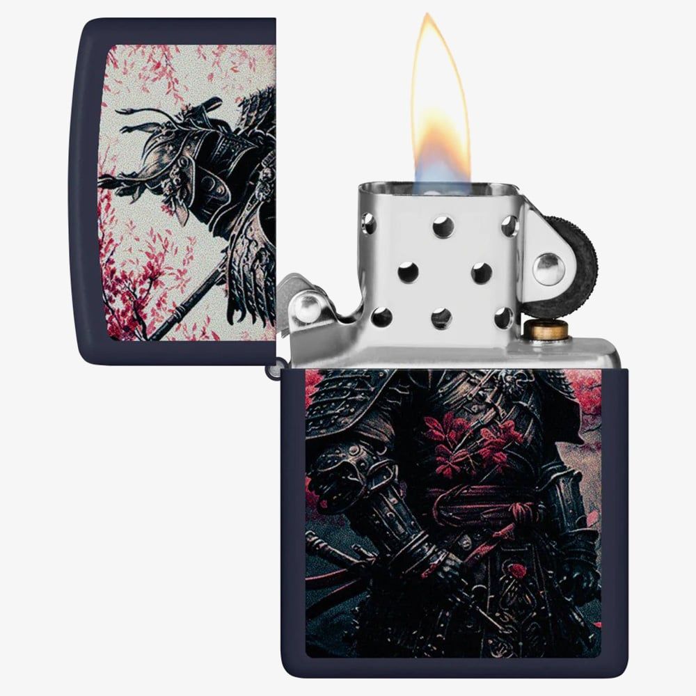 Surrounded by vibrant cherry blossoms, an armoured warrior commands the surface of this classic Navy Matte lighter in a bold, fierce design. This genuine Zippo windproof lighter delivers the unmistakable Zippo "click" and works virtually anywhere. It comes packaged in a gift box, making it a striking addition to any collection. Fuel sold separately.