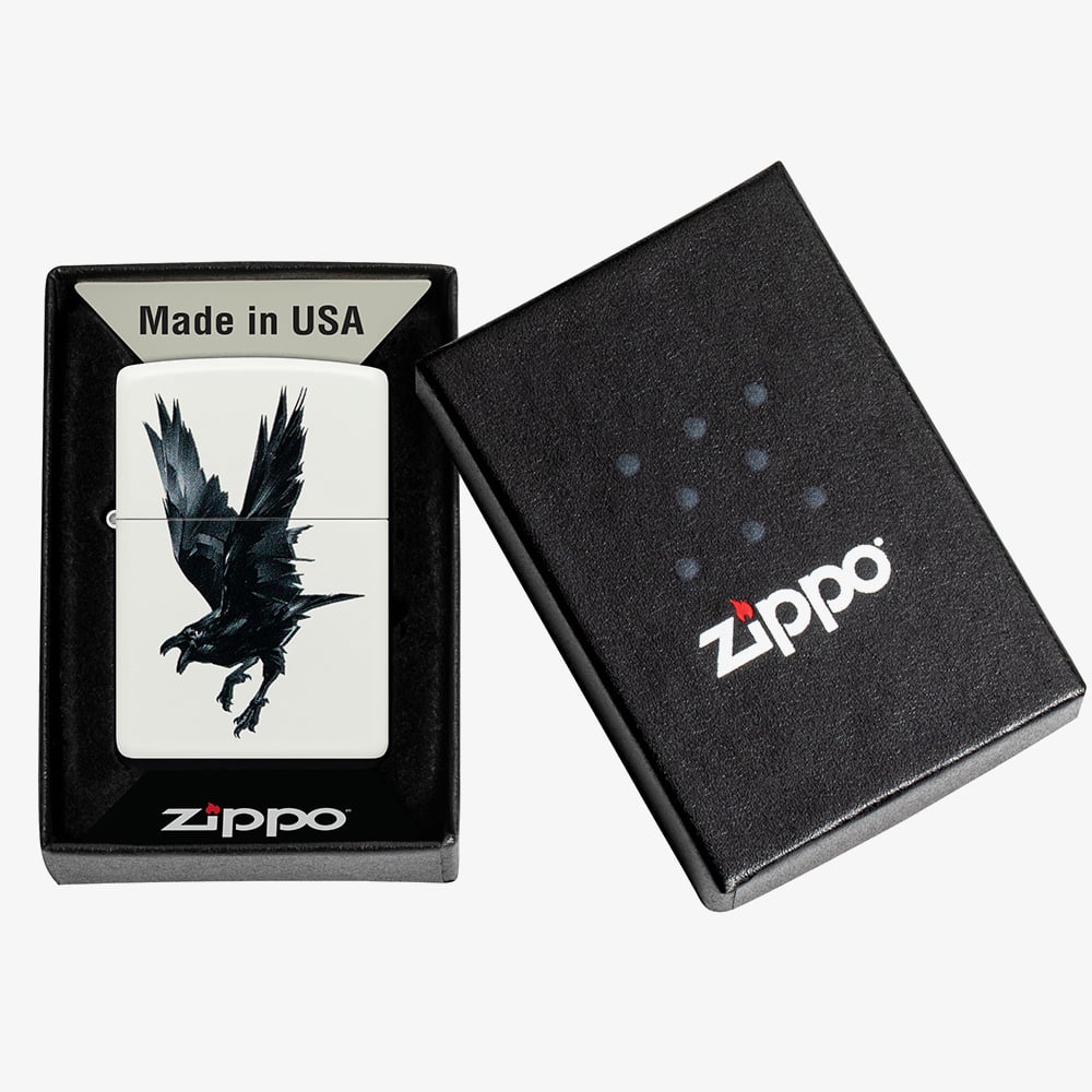 This sleek Matt White Zippo lighter features a mysterious raven design, adding a touch of intrigue and elegance. With Zippo’s signature windproof construction and iconic "click," this genuine all-metal lighter is built for dependable performance in any environment. Packaged in a gift box. Fuel sold separately.