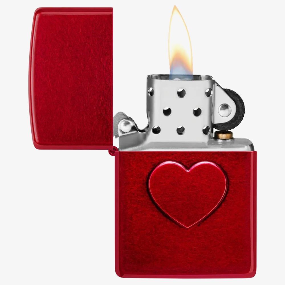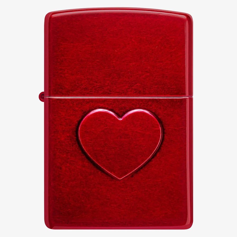 This classic Candy Apple Red Zippo lighter features a heart stamp at the centre, adding a unique touch of dimension and texture. A genuine Zippo windproof lighter with the signature "click," it boasts all-metal construction and a windproof design that works virtually anywhere. Packaged in a gift box. Fuel sold separately.